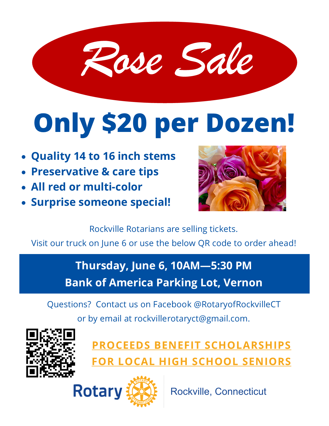 A big Rotary THANKS to everyone who stopped by to purchase our beautiful red and multi-colored roses. With your support, we raised over $4,000. All proceeds will contribute to our scholarship fund, which assists local high school seniors in furthering their education. To view a photo album of the event, please click here. For more information regarding our Rotary Club of Rockville Scholarship program, please click here. Stay tuned for an announcement regarding our 2024 scholarship recipients! |
